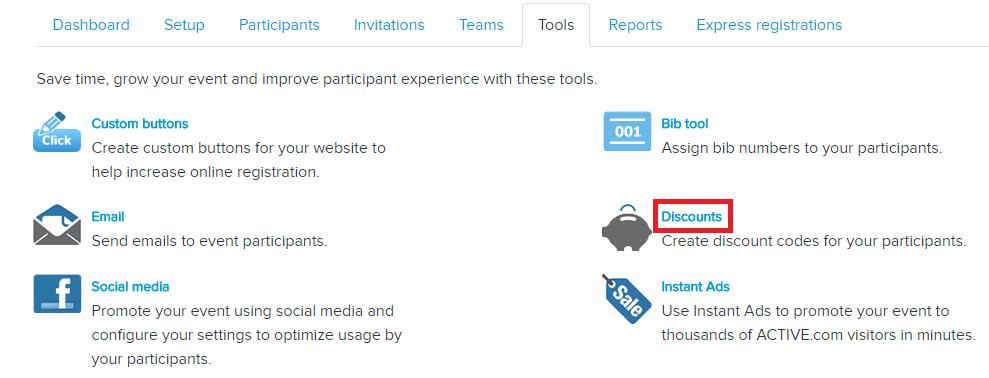 Create Discount Code - Active Network, LLC Only $5 will be charged for each item, it means the registrants only need to pay $5 registration fee and $5 T-shirt fee at checkout. Code: Unique code between 3 and 20 alphanumeric characters that participants must enter to receive the discount