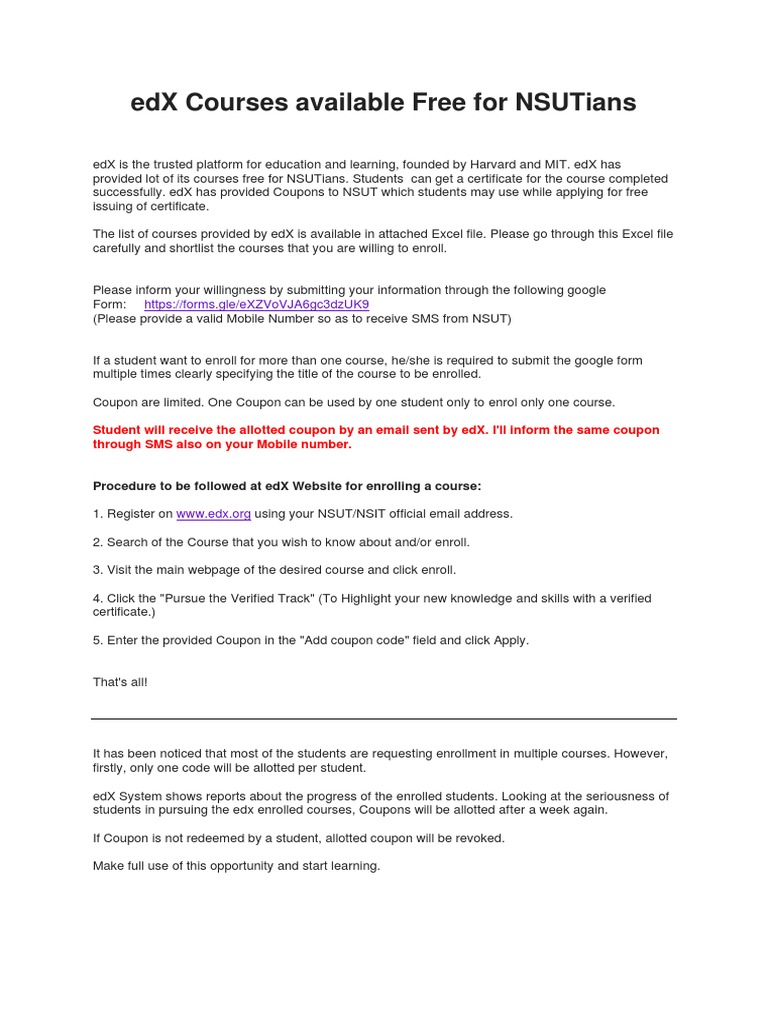 Want a Free Certificate? | 0.503x | edX HOW TO RECEIVE AND USE THE COUPON CODE. Go to XQ's Becoming a More Equitable Educator coupon website and register with XQ to receive your code. On edX, select "Upgrade to a Verified Certificate." You can do this on the "Course" page or in your dashboard. On the next page, add the coupon code you received and click "Apply.". edX Coupon Codes | 15% Off In September 2022 | Forbes edX coupon code: 15% off course certificates Get Coupon CodeBIENVENIDOAEDX 15% OFF 9 uses today 10% off when you purchase a program Take a Professional Certificate or MicroMasters program and enjoy... edX Coupon Code 2022 — (Get Upto 60% Off | August) - 2400Expert edX Coupon Code 2022 — (Get Upto 60% Off | August) edX Coupon Code - Up To 60% Off (August 2022) Karen W. MCFADDIN August 14, 2022 edX coupon codes offer exciting deals now and then for all enthusiastic learners. So if you are planning to purchase your favorite courses, Edx coupon codes can help you get them at a pocket-friendly price!